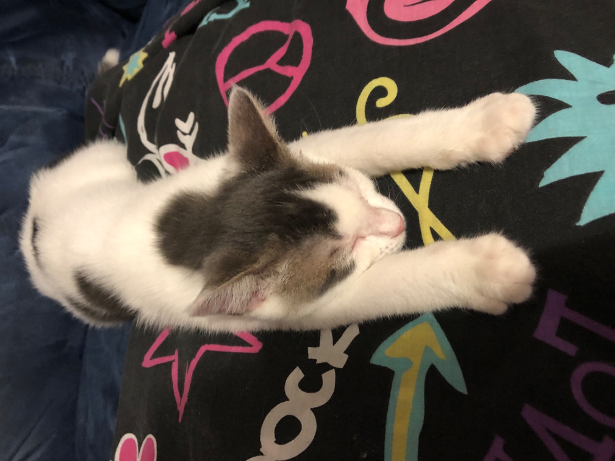 She is well socialised with humans and really loves people. She will be rehomed as an inside only kitten, this is for her own safety, and due to her pink nose and light colouring. She really is one of the snuggliest kittens I have fostered, and her new family will be so lucky to have her in their life. She has a blue mark on 1 side of her body that we think is almost a purrfect love heart, depends which way her fluff is brushed, and a white tip at the end of her blue tail.