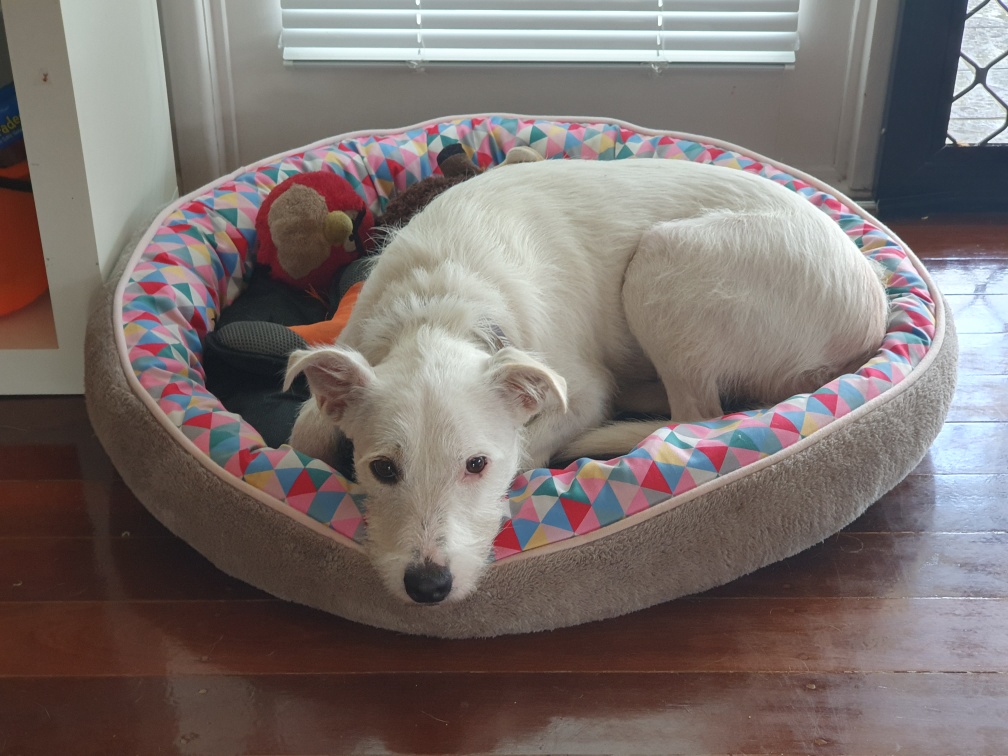 Luna is a medium size dog, she weighs 19kg. She's an interesting mix of Staffy x Westie.