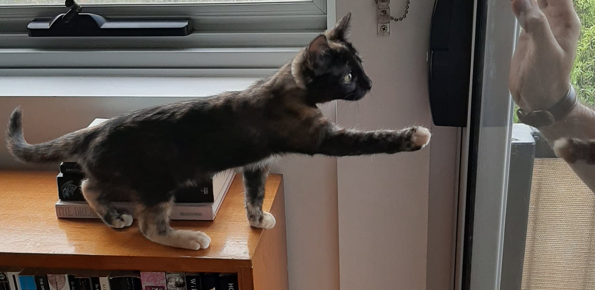 She currently loves burning off energy attacking wand toys, or carrying small scrunched-up paper balls around. She also likes to gaze wistfully out the window and watch the world go by.