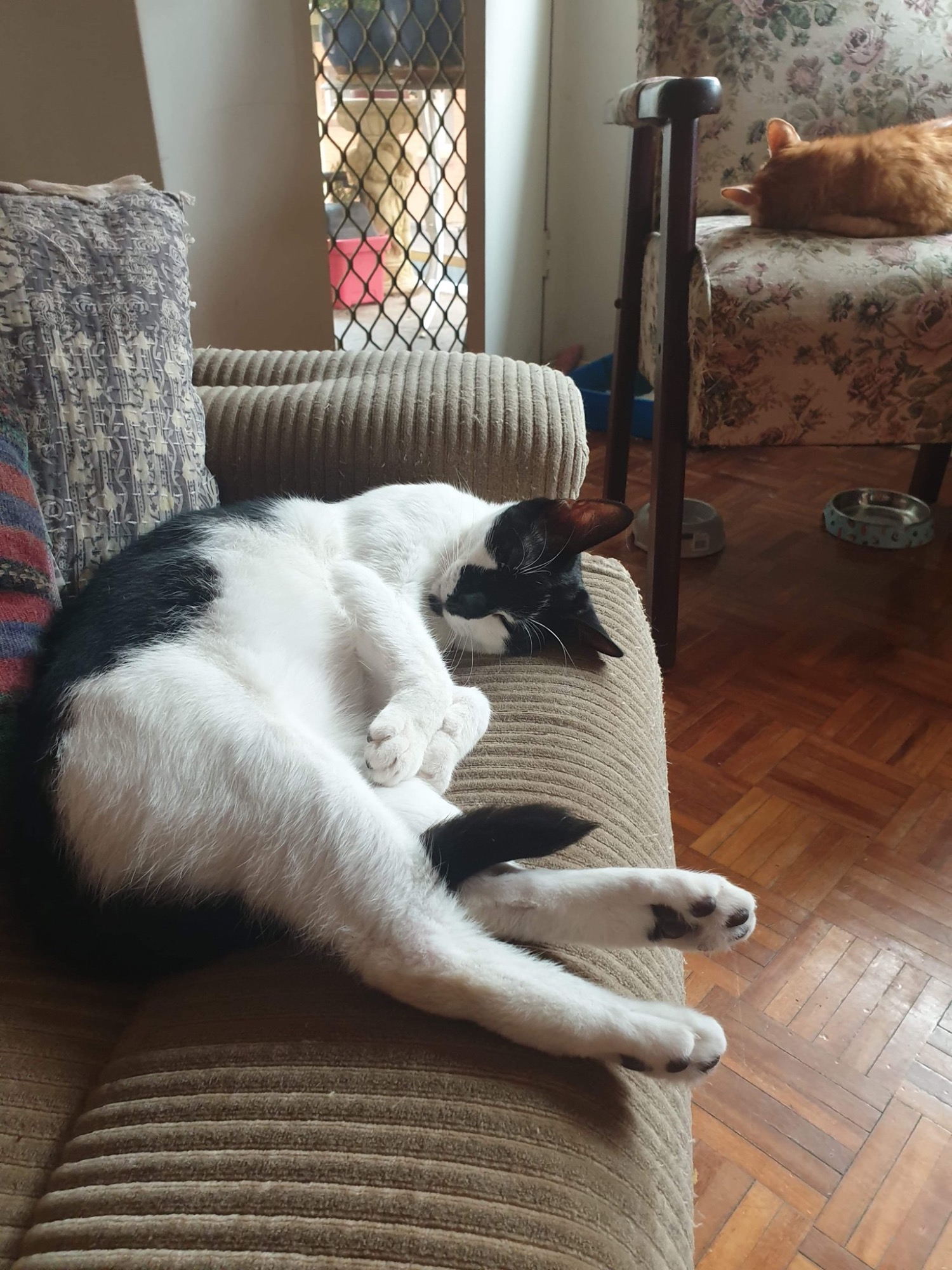 Panda is a gentle boy who is peaceful with other cats, he has a submissive personality and would be best paired with a gentle kitty friend. Panda is super happy in his own space and would be fine in a working household. He does like snuggles sometimes, and will happily sit next to hoomans, or offer rubs on your legs to let you know that you matter to him.