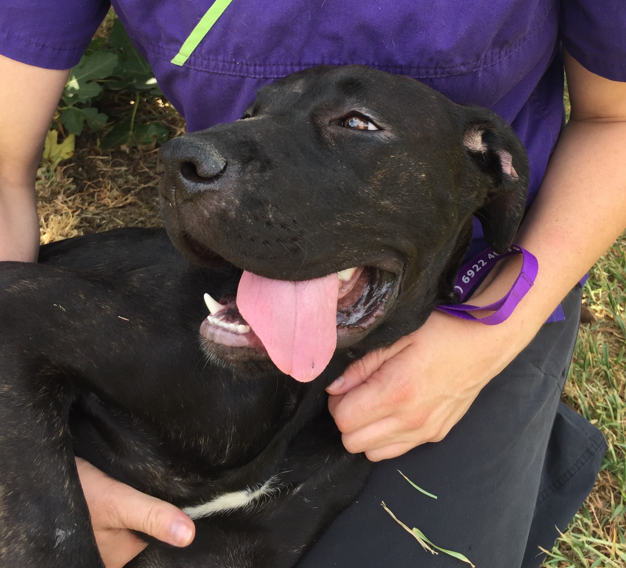 A sweet and always happy puppy, she loves hanging out with people and play time of course! She’s yet to learn how to use her long gangly legs but that doesn’t stop her!