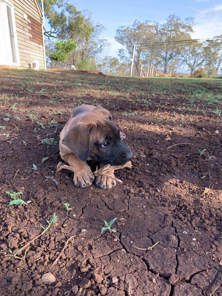 So far I know how to sit, wait for food, come, drop- and not to come inside unless asked. I have been exposed to lots of loud noises including machinery and a leaf blower, and they don't phase me one bit! My favourite toys are balls and rope toys, but all toys are fun to me! I am always up for a wrestle or game of tag with the other dogs. We aren't 100% sure on my exact breed mix. Mum is mid thigh height on adult humans, but my litter seem to be a bit shorter than she was. Maybe we are staffy x? Either way, breed doesn't really matter. All you need to know about me, is that I am very loyal, loving, energetic and intelligent. My mum is one of the most gentle, quiet girls the team has ever met! I will be a beautiful pet for any family. I look forward to being taken out on walks or park sessions 4 times a week, and would need a dog friend to be at home with during the day.