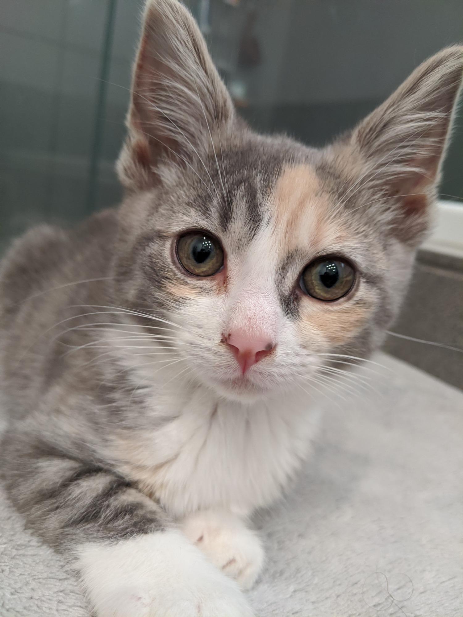 Smudge is a very pretty little kitten who loves a game with her siblings. She has a loud purr and is very happy to use it. She talks a lot - fortunately not too loudly. Gets on well with adult cats and kids.