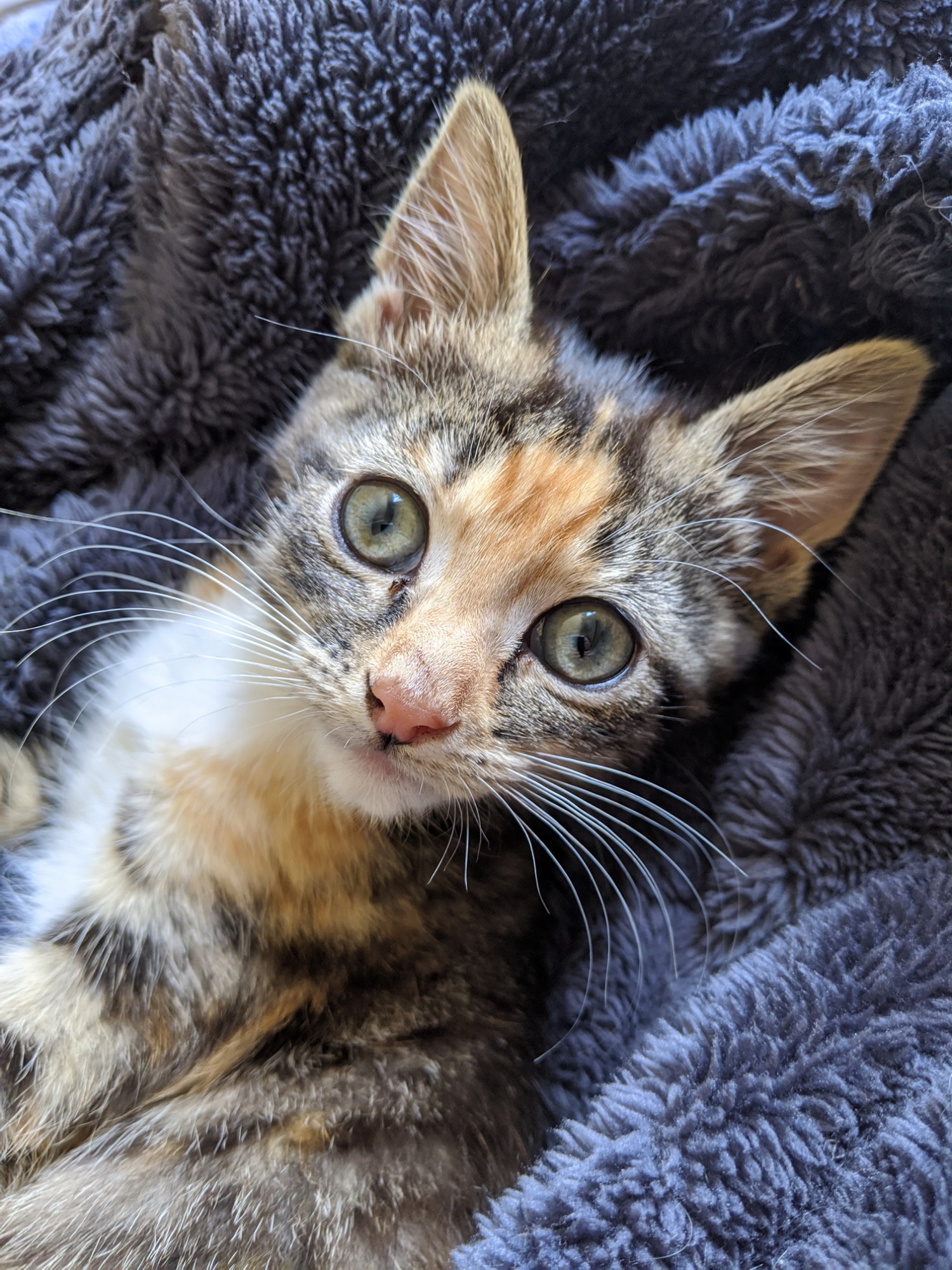 Jaffa is a tiny little purr machine who happily snuggles up. She loves a game with her siblings, but is also very confident to explore on her own and seeks out human company. Jaffa also gets on well with adult cats and kids.