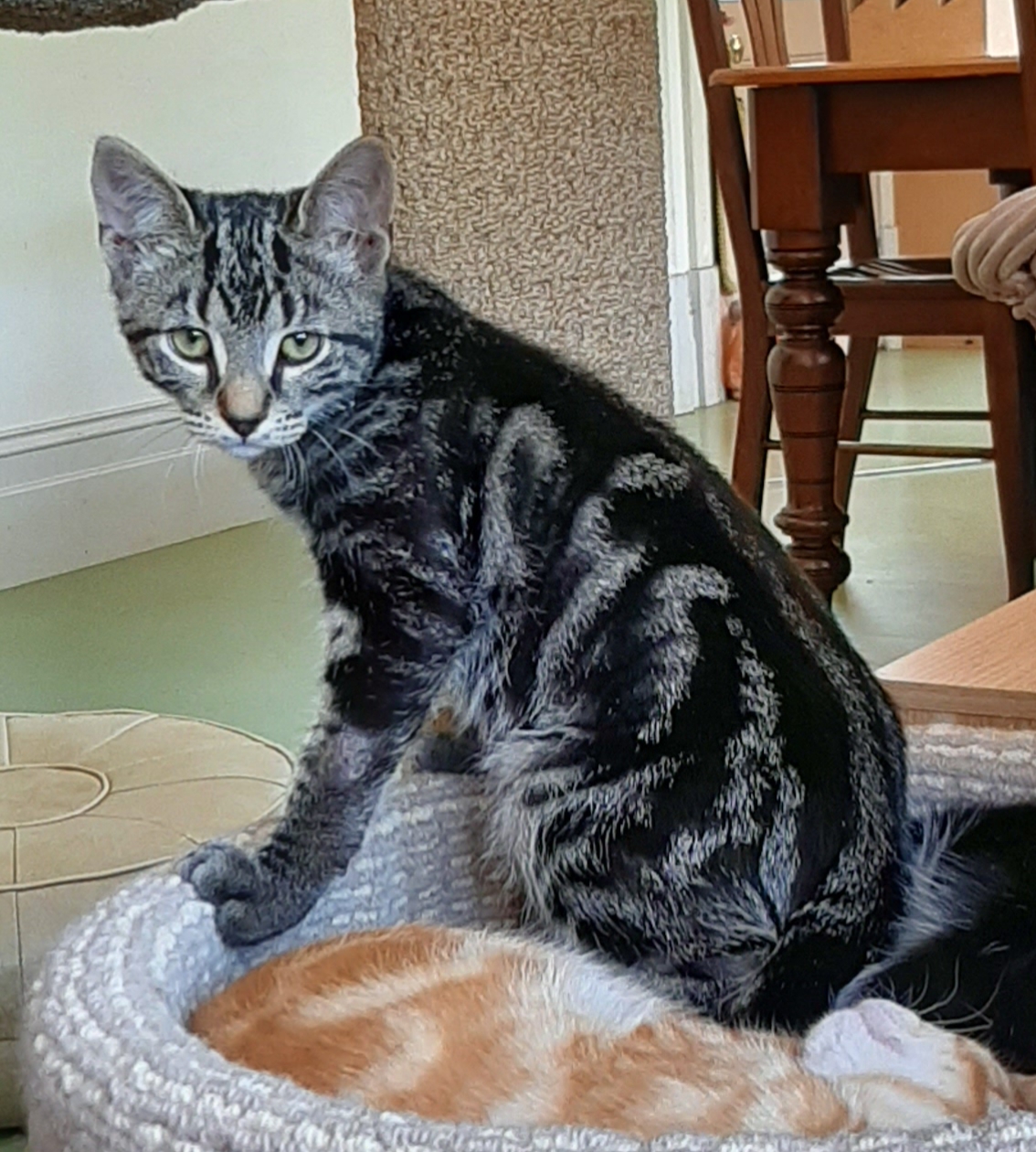 He came into care with his brother and sister after living rough on the streets. He's the first of the litter to enjoy cuddles. He's funny and playful and happy for quiet cuddles too.