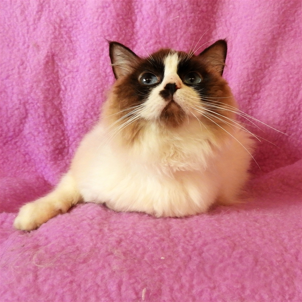 Delightful Dax is a typical Ragdoll! She flops and freezes when she is unsure of anything, and enjoys human snuggles.