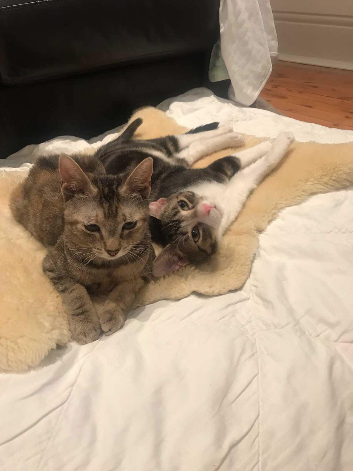 They were found in a cat crate, laying out on the street in Newtown in the pelting hot sun with a cardboard sign saying "Free kittens" on it. When they were found, they were starving, dehydrated and almost unconscious. After receiving excellent treatment at the local vet, they came to us to spend some time in foster care and find their forever homes.