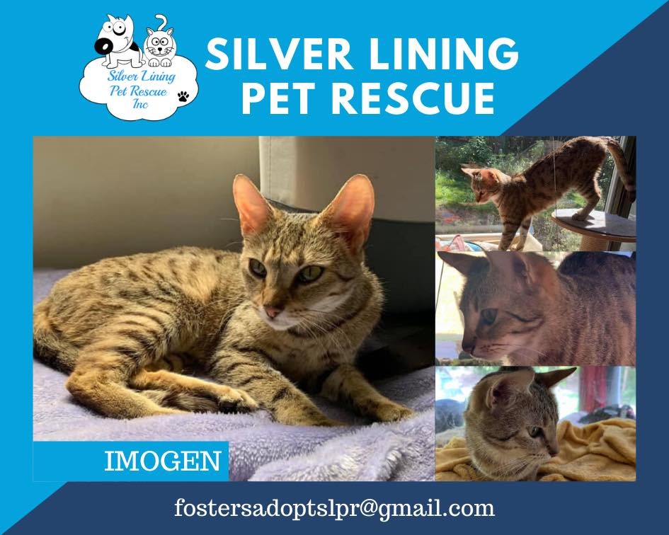 Imogen is a stunning girl with a very oriental look to her. She may be part Egyptian Mau or possibly Bengal and has a beautiful, affectionate nature. Imogen came to us from a pound where she was scheduled to be put to sleep. Shortly after her rescue, she gave birth to some gorgeous kittens, that sadly didn’t survive. It’s her time now to find her very own home, where she can be loved and spoilt. We think she is about 1 year old but has been through way too much already.