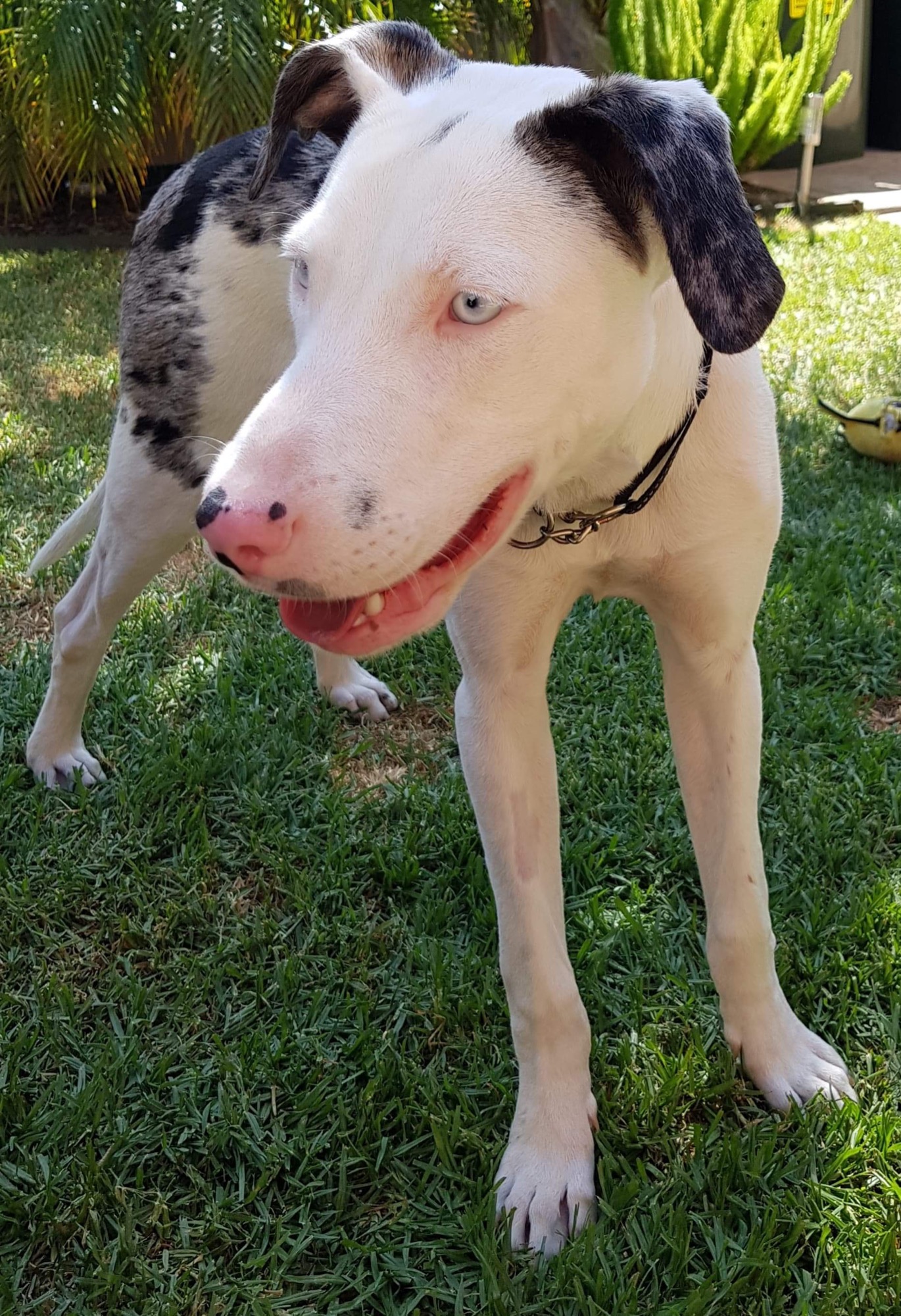 Yang loves to play with other dogs, so a fur-sibling at home could suit him well, or otherwise, plenty of opportunity to express his enthusiastic and social personality. Being a young fellow he's really a clean slate when it comes to training. He has demonstrated respectful behaviour towards children, under supervision of course, and just needs a little time to warm up to them. Yang is not recommended for a home with a resident cat at this stage. He has been learning basic obedience commands in his foster home with vigour. Yang spins around in circles of excitement when food is on it's way and despite his long, slender legs, he rather fancies himself as a lap dog! Yang likes to curl up into a little ball for a snooze when he's not chasing his tail or playing tug of war. One of his clever tricks is to hide something he shouldn't have in his mouth - but he always gets tricked into giving it up when someone calls him over in an excited voice!