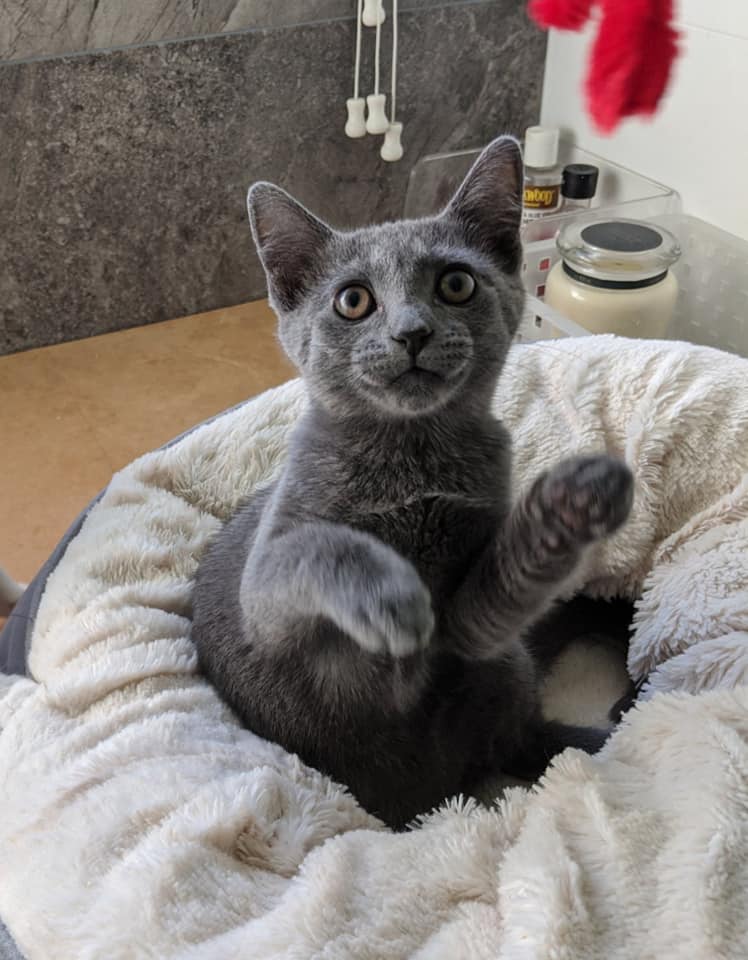 Bluey IS however still a kitten and does like to PLAY HARD. I regularly see him drifting around the kitchen island, chasing after his two sisters, or a pom pom. He loves those a lot. Bluey will need a home where he will have plenty of attention to help maintain his good nature.