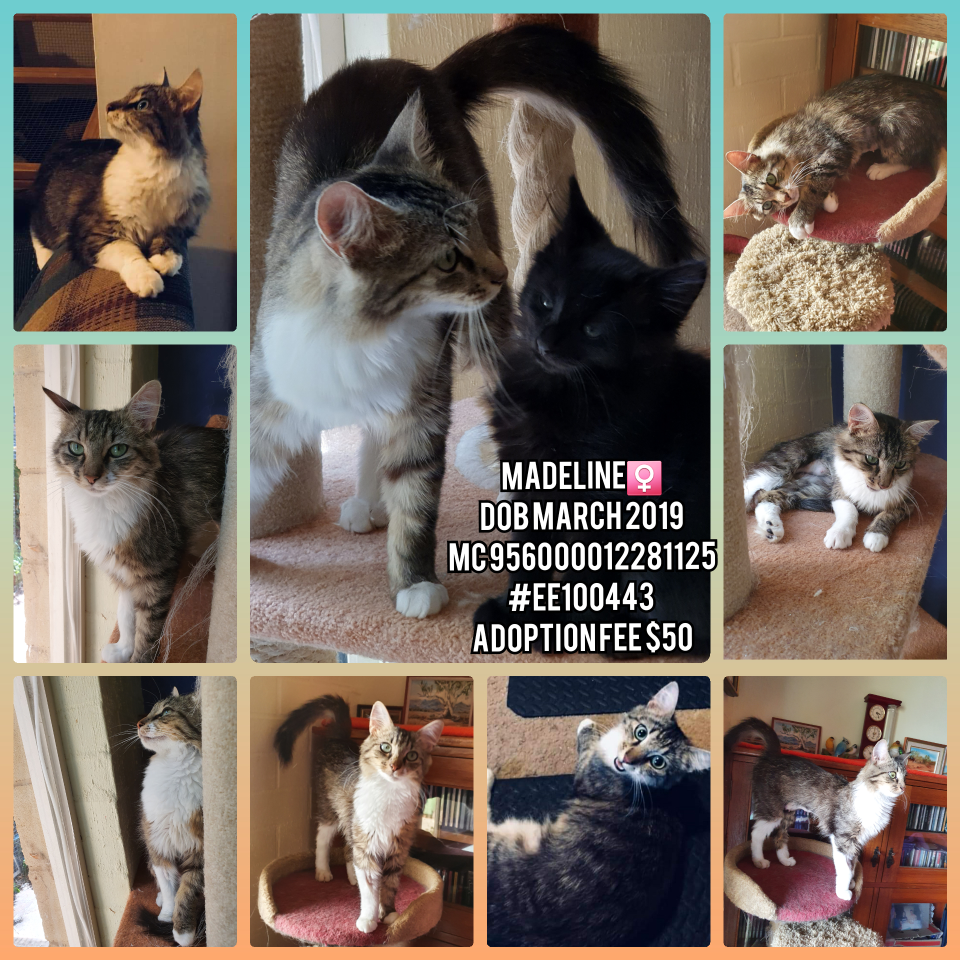 Since being in CARMAR care Madeline has weaned her kitties , been desexed,Michrochipped and vaccinated, has put on some much needed weight and is now enjoying the relative peace away from her kittens , in a quiet foster home.Madeline is a very sweet, gentle lady.
