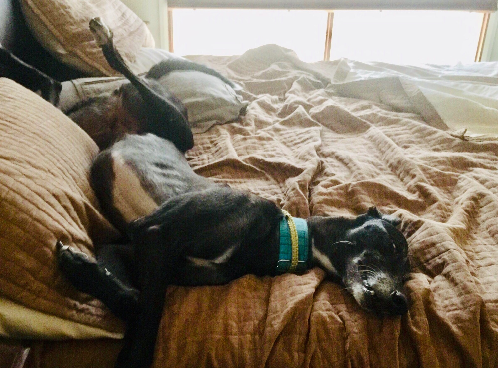 Now she is absolutely loving life as a pet! She's very affectionate, and has fit right in with her several foster brother and sister greyhounds. She enjoys a short walk, and a cheeky little play (but not too active, thanks!), and on her return home will happily head to her very favourite place...her foster mum's bed (though she loves the spot under the desk if there's a lovely human sitting there!). Though mostly calm, Piper can get anxious, and is absolutely terrified of storms. She's good with other dogs, but would also be okay on her own, though we think she would do best in a home with a human who is around more often than not.