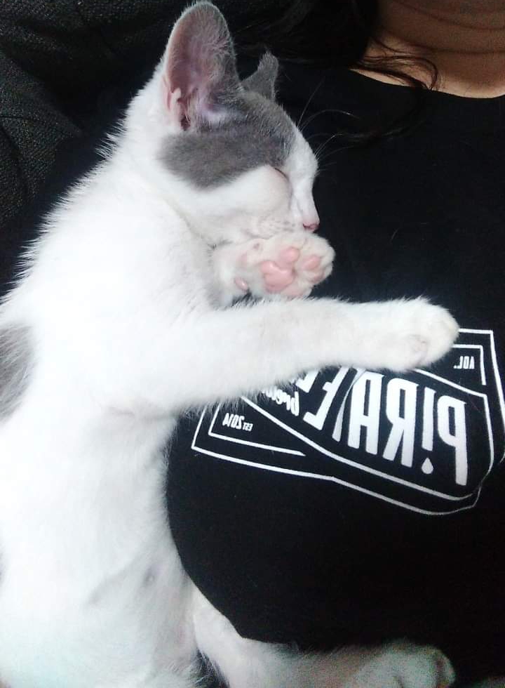 She is the sweetest and most loving girl. She's still a tiny little thing but has a massive heart. She will meow at you for belly rubs and chin scritches, and one of her favourite activities is falling asleep on your chest after she's successfully completed her solo expeditions of getting up on the couch with you while you watch movies together.