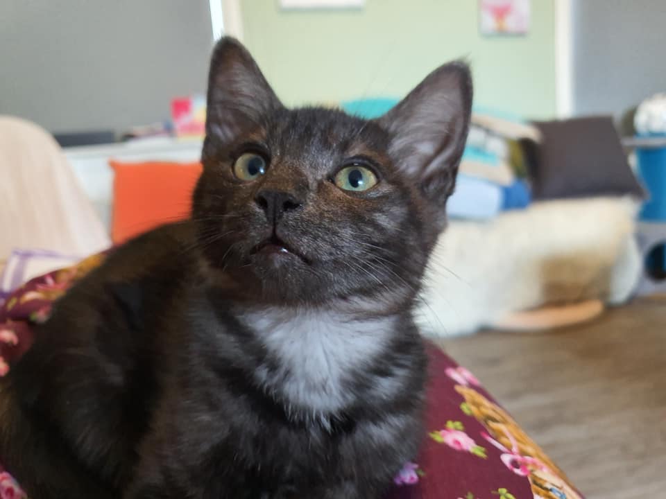 Smokey is a very sweet, gentle and soft spoken kitten. This little one is looking for a nice quiet home where she can cuddle with her humans and watch some netflix. Smokey is definitely destined for the lap kitty life and is looking forward to meeting her forever people.