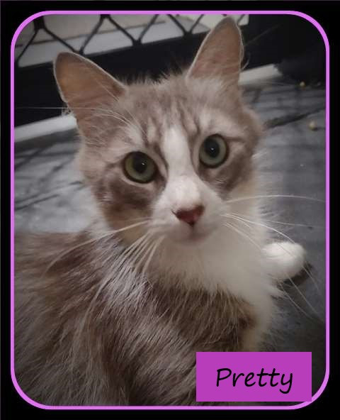 Pretty is her name suggests a very pretty little girl. She will never be a big cat, more a petite size. She has done a great job raising her 5 kittens who are now being adopted also. Pretty is a gentle girl with a big voice. She will let you know when she wants your attention and her dinner which is very important to her – life as a dumped cat can make you very hungry, especially with kittens on the way. She loves to just hang out with you.