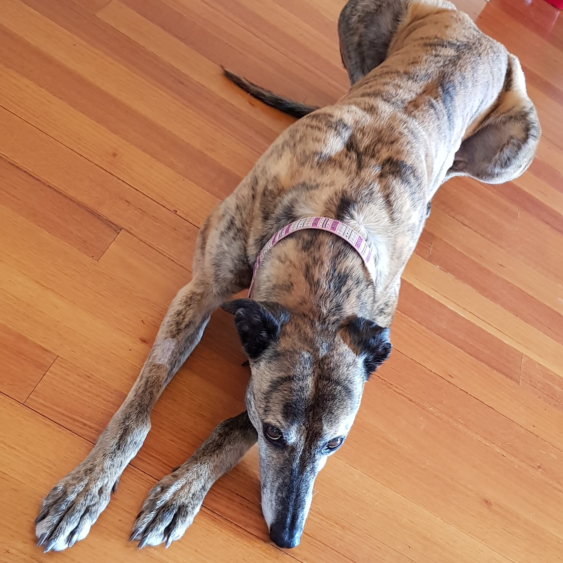 Kadia is a very sweet and friendly dog, who will be happy to fit in with whatever your family is like. She is a stunning red brindle with a sweet face to match her good nature. She is not needy, but she likes to hang out wherever you are. She will join you for TV or will have fun exploring your garden if you are outside. She is a very easy dog, who should cope with being a solo dog, if you are working full-time, but will be very happy to see you on return. She is currently living with another greyhound and they get on fine.