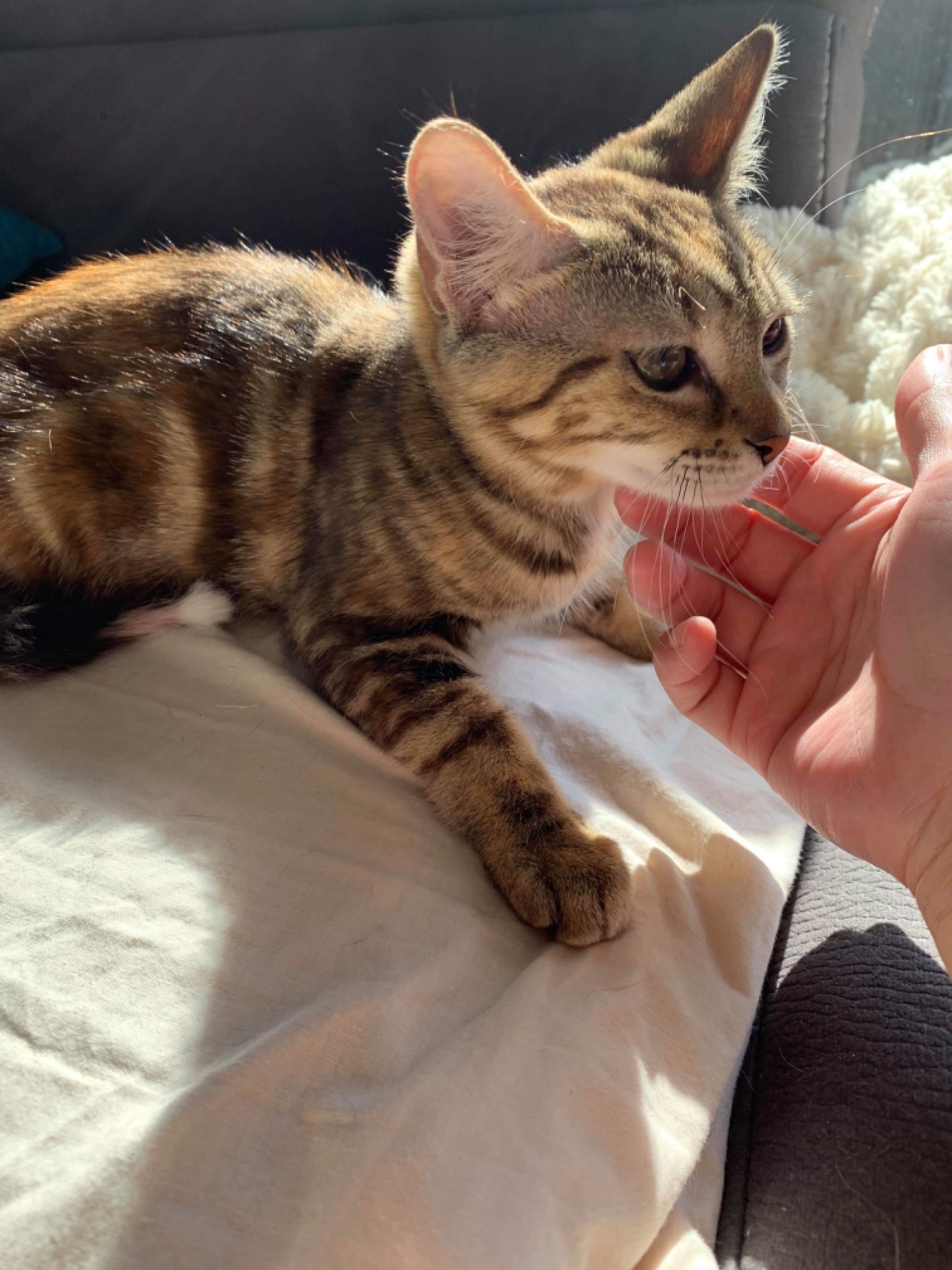 Toffee is super snuggly and affectionate. She is happy to chill on your lap and purrs her little heart away. She is smoochy and calm and will be suitable for both working couples or families with children.