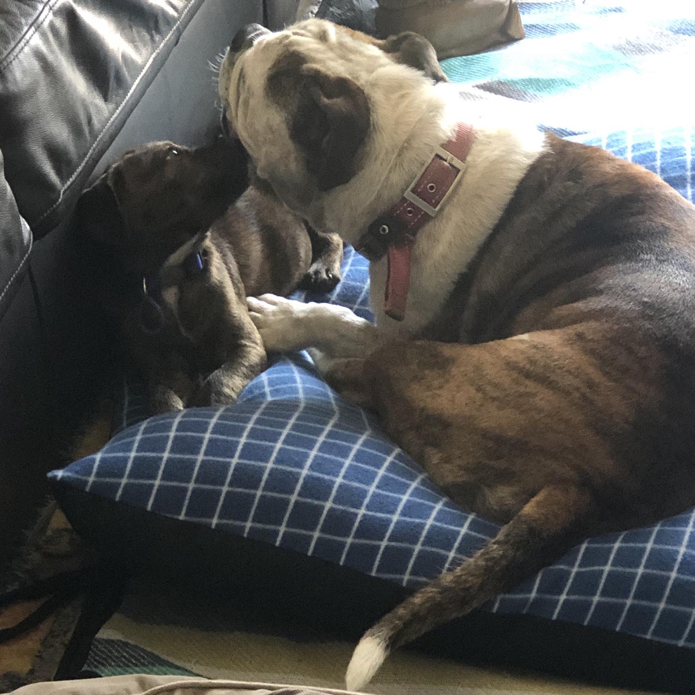 Stella loves people and loves to be cuddled when she is tired. She has a big personality and loves playing with her foster sister Bella. She is very sociable with other dogs and is not reactive to cats. Stella has flourished since being rescued from death row with her siblings.