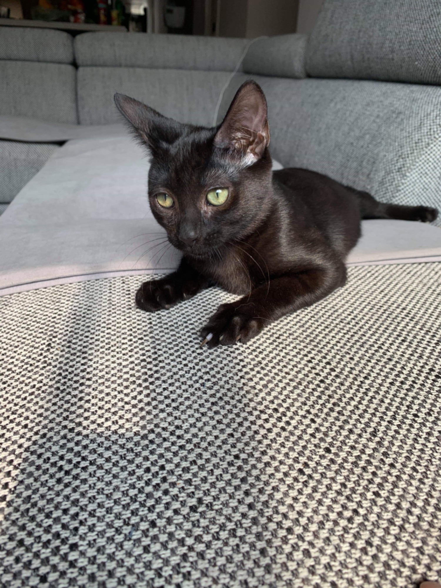Pepsi is a gorgeous black kitten with shiny black fur and petite body. She is very sweet and affectionate. Pepsi might be a little shy with strangers initially but once she knows you, she is the sweetest little kitten ever.