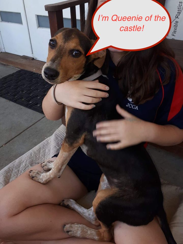 Queenie is house trained and sleeps through the night indoors. She can be a little timid meeting new people, but warms up very quickly with reassurance and will then be full of kisses and cuddles. She absolutely believes she is a lap dog and will snuggle up on your lap on the lounge for cuddles at any opportunity.