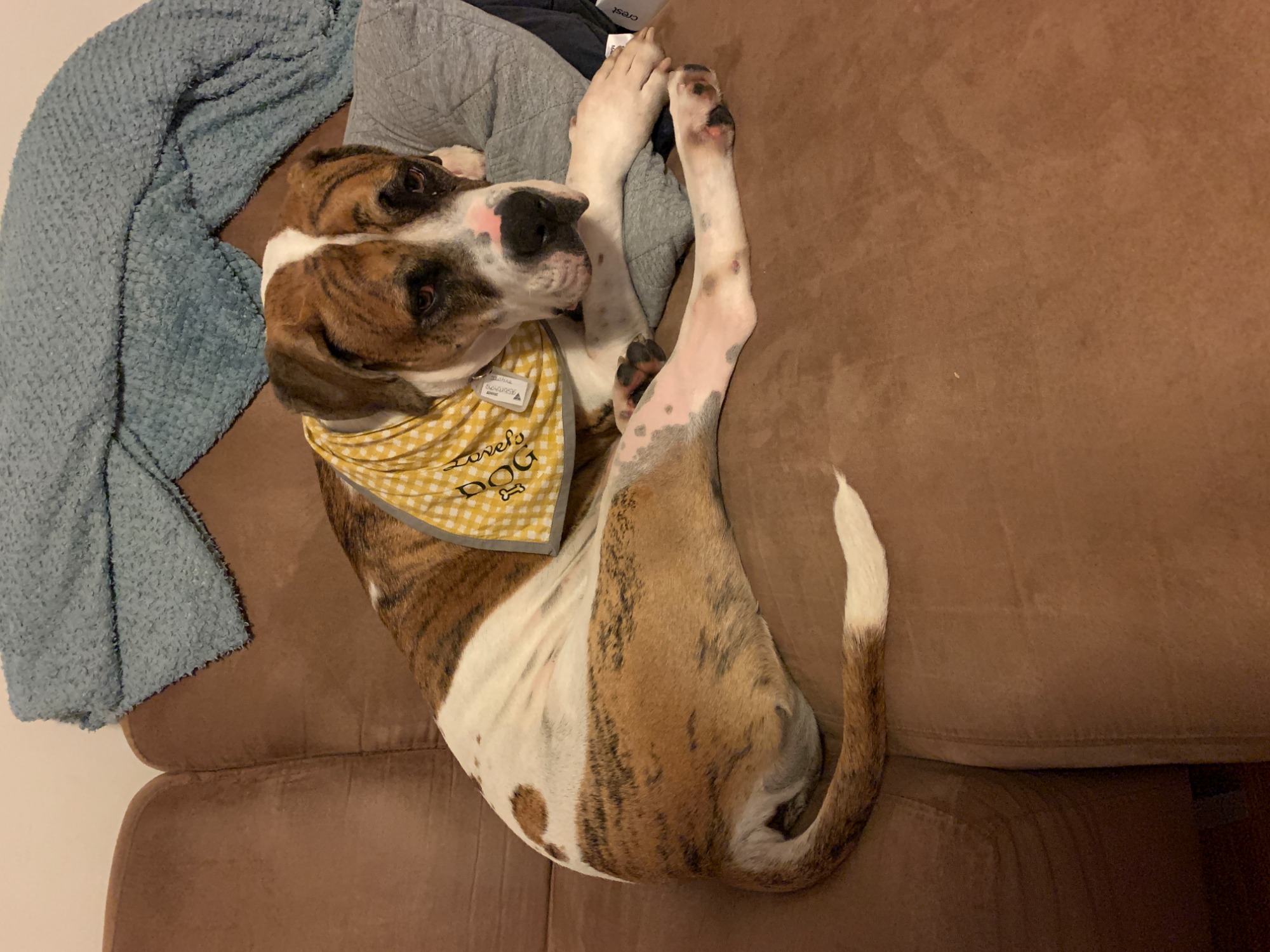 He loves to sleep and cuddle, he’ll often fall asleep with his big head on his humans' legs while watching TV or chilling on the couch. He doesn’t chew on anything or destroy anything.