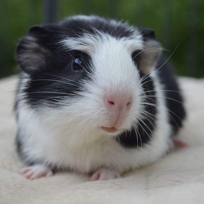Pepe was born at the shelter to rescue pig, Curly, on the 13.1.20. He has 3 sisters: Betsy, Chockita and Adeline. Pepe has a crest on his head, which makes him look like he has white eyebrows! He is a very sweet and loving fellow.