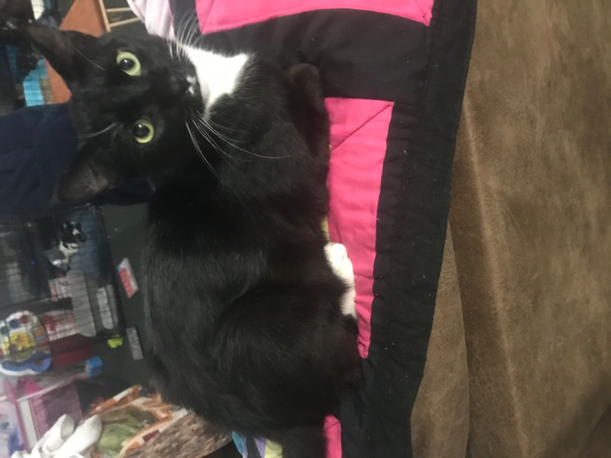Tux is smoochy and loving, he will accept any pats and rubs possible.