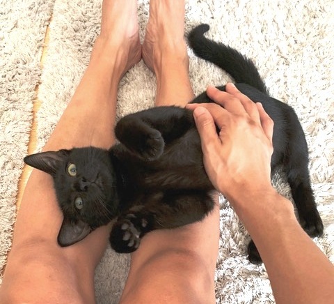 Sooty is a lover, not a fighter; whilst he now has the energy to play and plays with enthusiasm, he does not scratch or bite his foster parents, and loves nothing more than a belly rub. He is not a lap cat (as yet) but loves to lie alongside his humans and use them as a pillow.