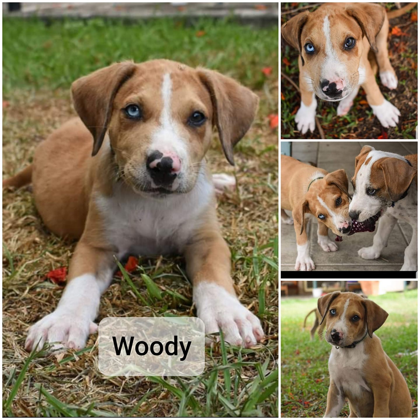 Woody just loves to play, always bounding around his siblings and playing tug-o-war or jumping on them to get their attention. He loves snuggling up with them when playtime is over, and is happy laying at your feet when you are sitting outside.
