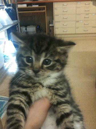 This is our lovely rose! she is a 7 week old domestic short hair kitten. She was bought into the stud park vet with her 2 sisters! they were found abandoned. She has a dark tabby coat. She loves playing with her sisters very much and also loves playing with any toy she can get her paws on! at bedtime she is happy to snuggle with her sisters and the staff. She has yet to be introduced to any dogs but we are confident that she will adjust quite well with time. She has been introduced to other kittens at the hospital and has been delighted to have a new playmate. She is great with kids and people, especially because of that extra handling!