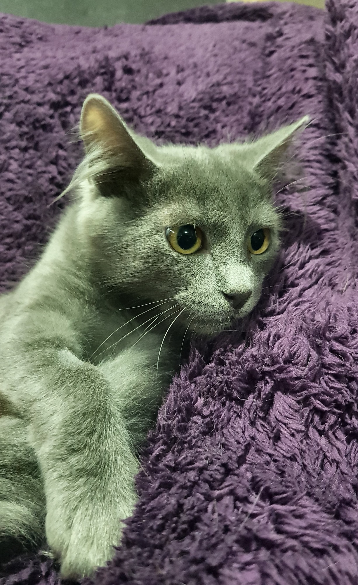 Silvertip is a handsome young man who loves a good cuddle with his foster humans, but can be a little timid when he first meets new people. He loves to run around and play with his sister Astrid, or relax and watch the fish swim in their tank. Silvertip is happily amused by anything that dangles and is usually seen carrying a hair tie around in his mouth. While super cute, he also has a cheeky side - when he's hungry he'll let you know by nibbling at your toes!