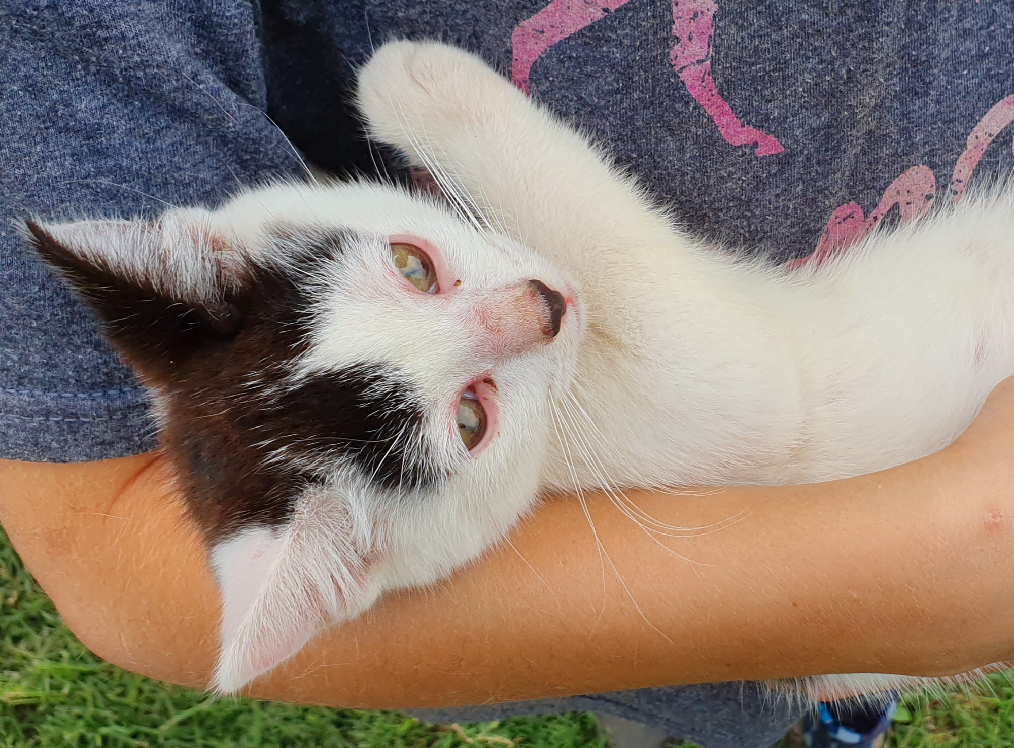 Little Ron came into care with his brother. He is playful with other kittens and loves to snuggle with people.