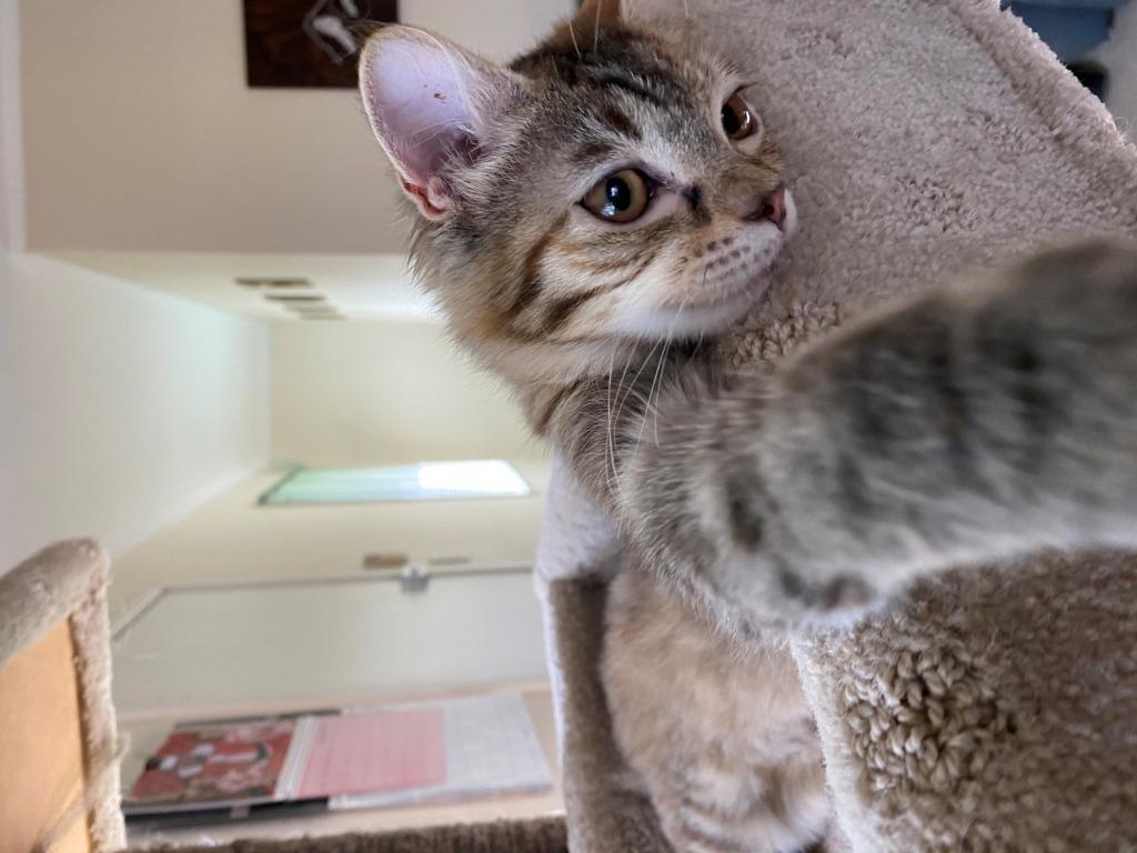 Hello, my name is Swatch and I am a dainty little girl with very fine features. But don’t let my looks give you the wrong impression I have a mischievous side. I absolutely LOVE having other cats around me and will get them wrapped around my little paw as I have done with my foster brothers, they cuddle me, play with me, and groom me there is nothing that they will not do for me, and that includes letting me eat all their food.