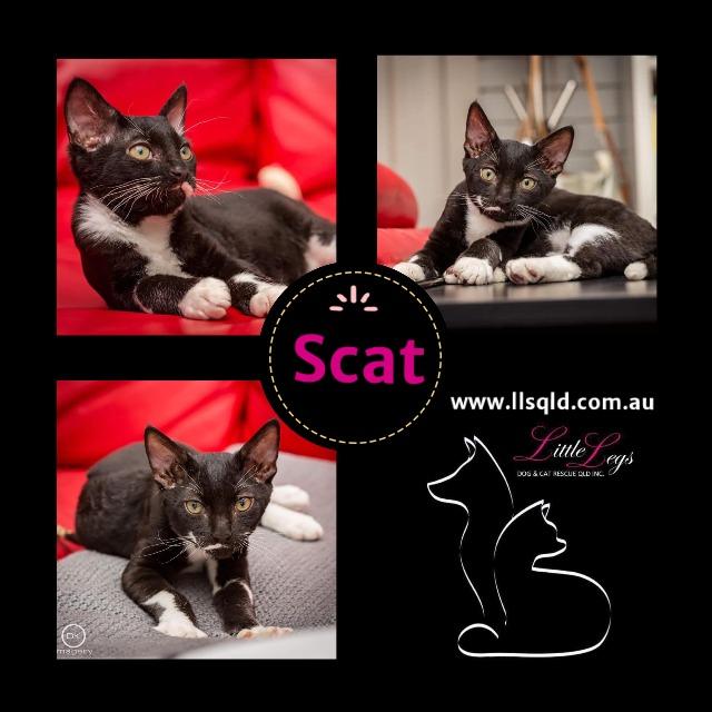 Scat is a little boy, who was saved from a rural pound at a very young age, along with his brother, Diego. Scat is affectionate and loving, although not quite as obsessed with humans as his brother. His half moustache and unusual markings make him quite unique.