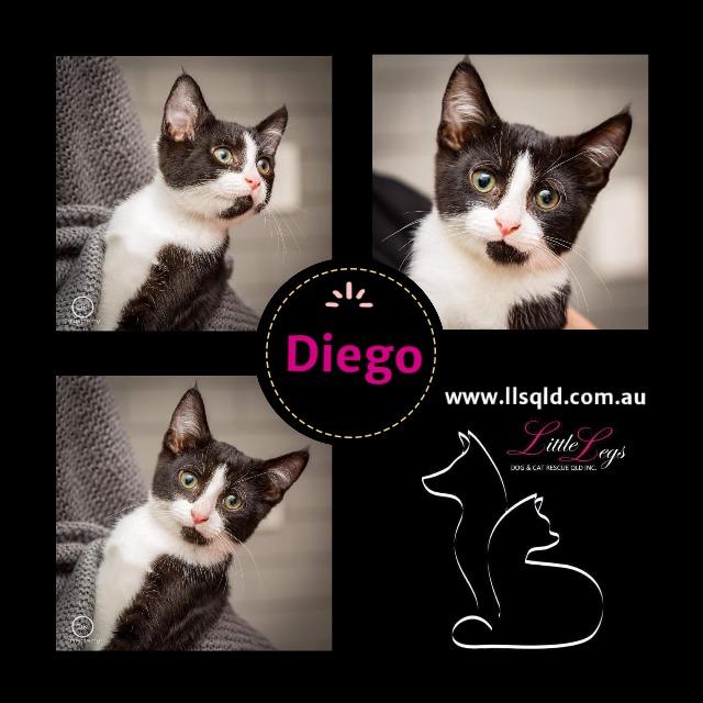 Diego is a sweet little boy, who was saved from a rural pound at a very young age, along with his brother, Scat. Diego is very affectionate and loves humans immensely, but is also great with other cats.