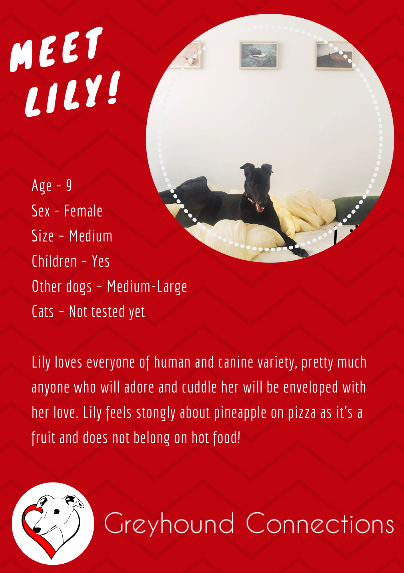 If you would like to find out more about Lily, please send an email to: hello@greyhoundconnections.com.au or enquire via our website/FB page.
