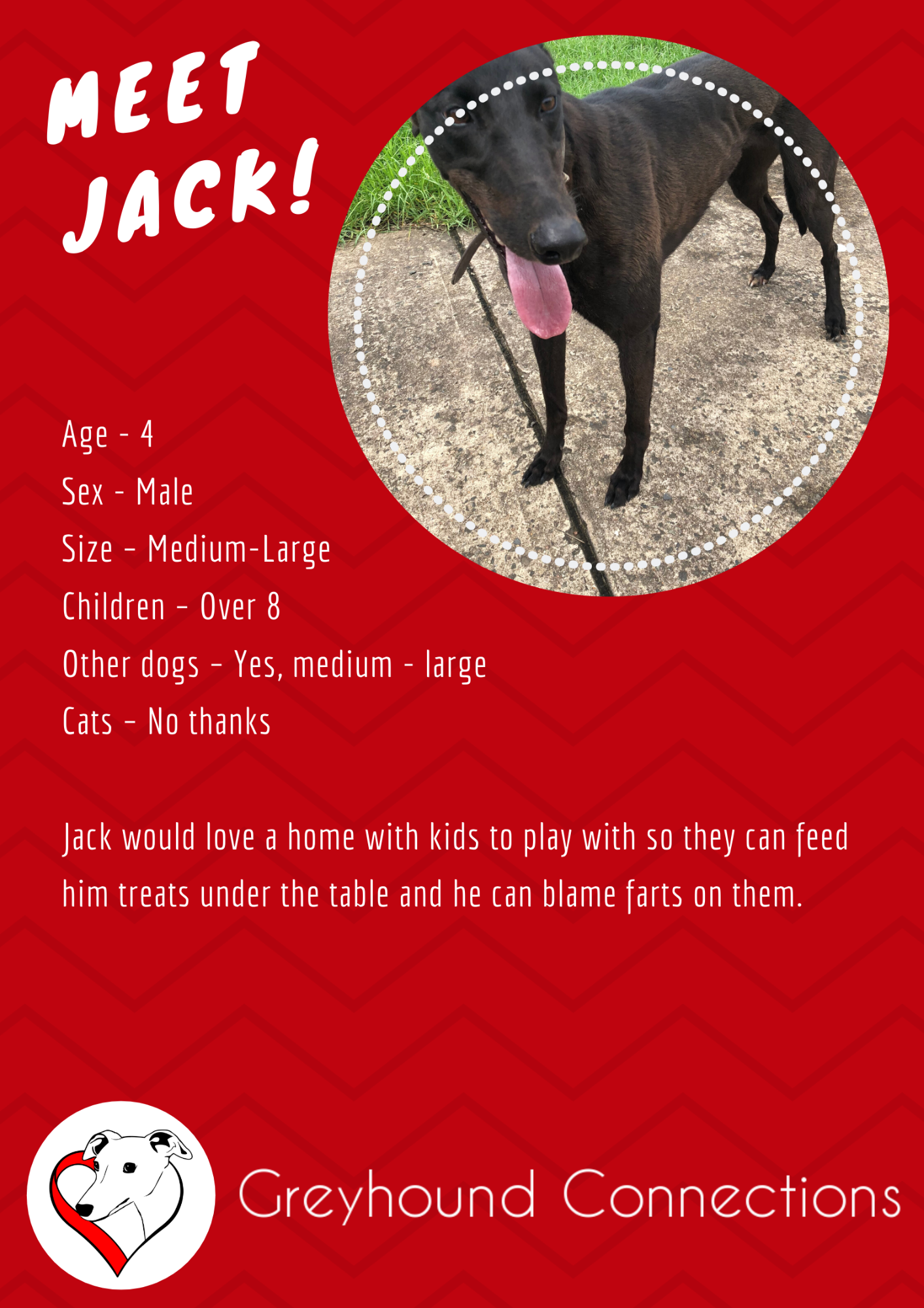 If you would like to find out more about Jack please email Greyhound Connections at hello@greyhoundconnections.com.au or submit Adoption Application Enquiry via our website: www.greyhoundconnections.com.au