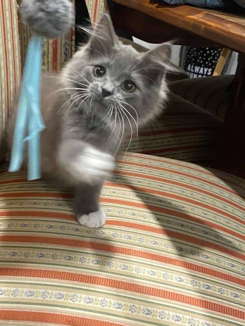 He has come a long way in regards to his fear of people and is learning to trust. Houdini very inquisitive and loves exploring but equally he loves affection and purrs so loudly when you give him cuddles. He likes being picked up, loves to sit with his humans on the couch, and adores a good chin scratch! Tuna is his favourite treat, and he loves to play with the mouse on a string toy. He thinks an ice cube is the best kind of toy to bat around the house and is super interested in water. He is a beautiful looking cat, so very cute and his little squeak for a meow is just the icing on top.