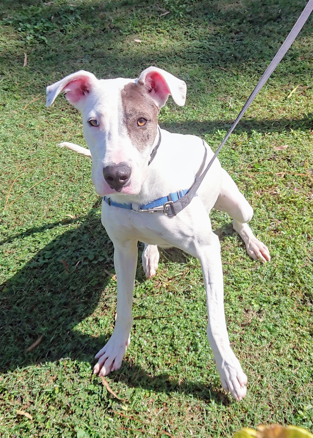 I'm a high energy, social girl who loves to feel the wind in her fur and the ground beneath her paws! I'm very well known for my socialising and more often than not I'm unaware of my size and can rush up rather quickly to other dogs. So please be patient with me as learn some basic dog etiquette. So at times I forget I'm a big girl and jump up rather enthusiastically but positive training I will learn to be on my best behaviour. When I am introduced to new doggy friends I can become overexcited but I will settle down. When we go on adventurous walks together you will need to have a very firm hold on my lead as I am a powerful girl. So my new owners will have to be a family who are prepared to have a large breed dog as part of the family. Yes there will be quiet, gentle times where I will love tummy rubs, cuddles and falling asleep curled up by your side. But most of all I'm looking for a family who will love me to bits. I will need a large, secure yard with 5ft fencing to keep me safe. When you do go out leave me with long lasting treats and durable toys and I'll be a happy girl. I will need to meet any potential canine housemates so please bring them along for us to meet. I'm ready to bounce into your arms and heart!