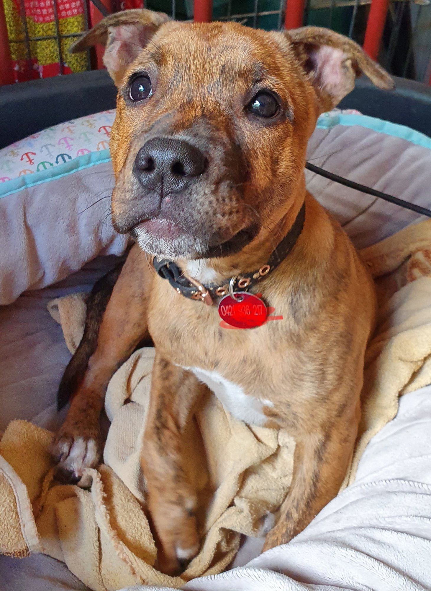Stevie our 13 week old female english staffy pup cross is ready to start looking for her stable loving home.