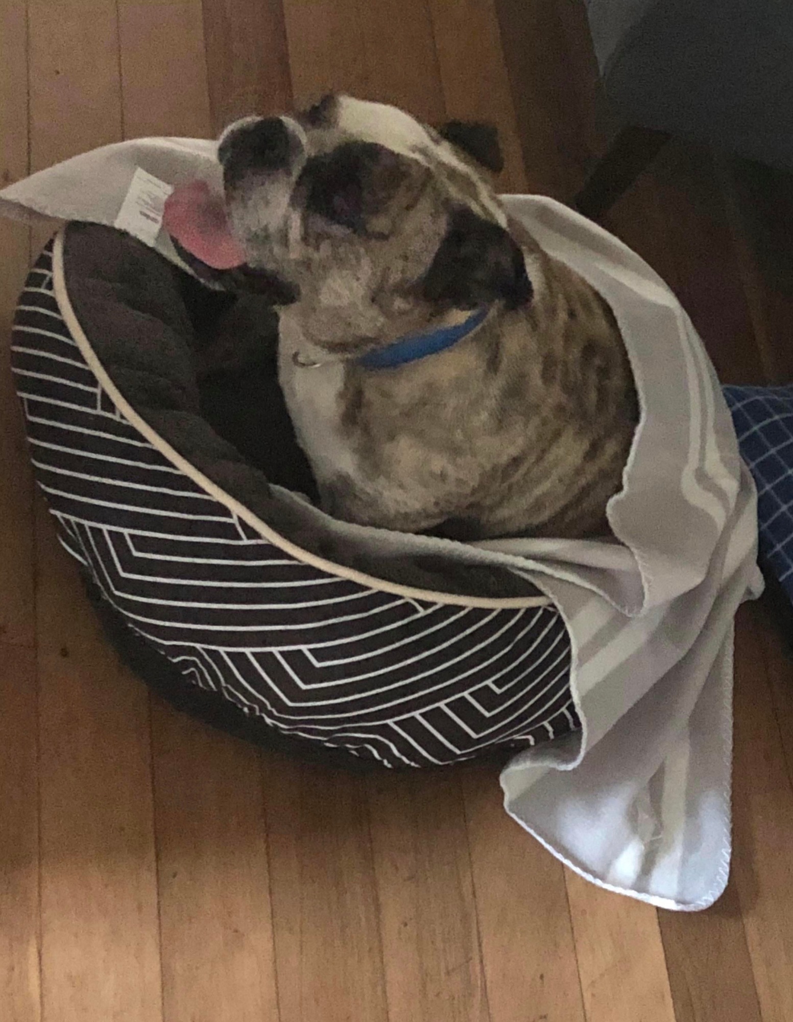 Bella is happy to sleep on a spot on the couch (you do have to help her up) while you watch your tv show (maybe ensure before applying you have a working remote control - the snoring can sometimes drown out the dialogue!) or in a dog bed in the loungeroom with her people.