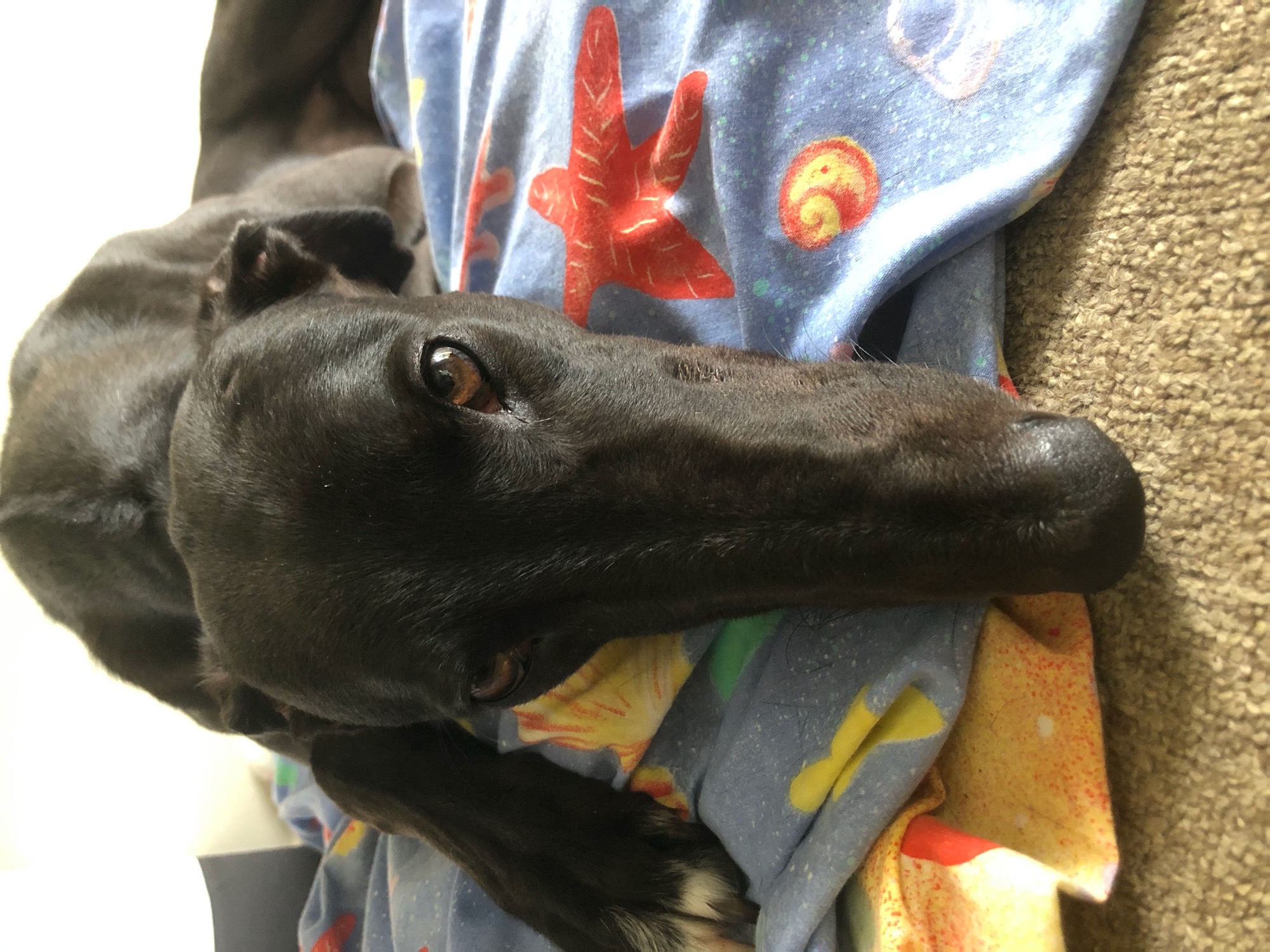 Dora just loves to give big greyhound cuddles by resting her head down on your stomach. In her foster home, she is allowed on the couch and loves being next to you resting her head on your lap.
