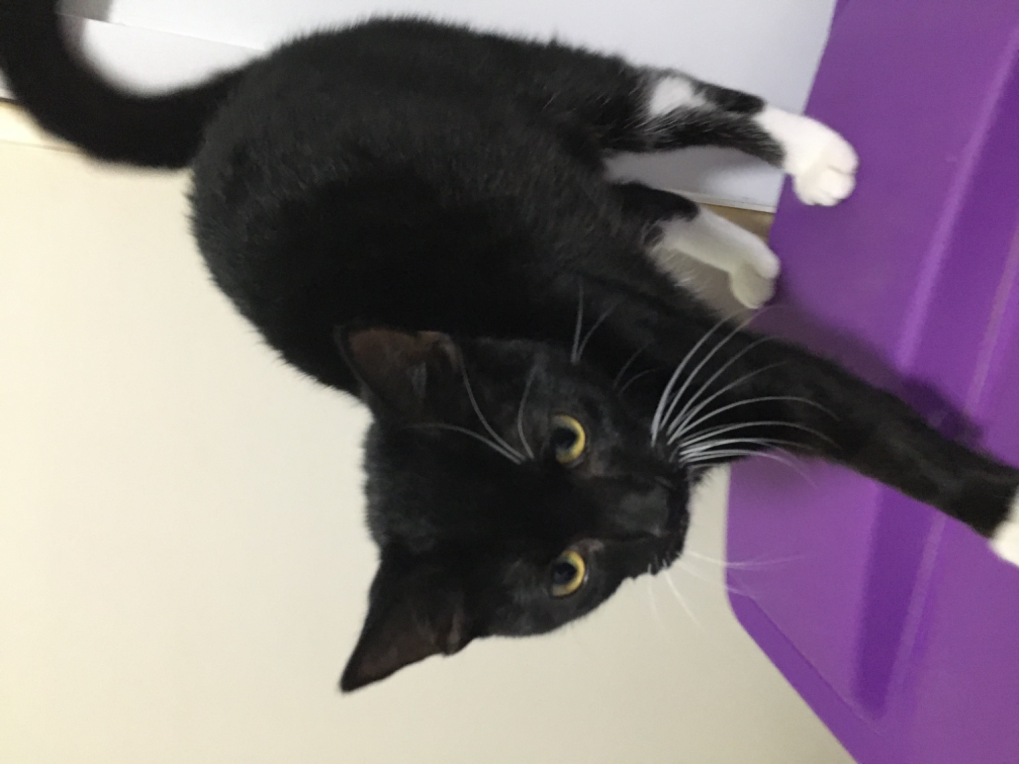 Gizmo is a beautiful black and white, 6 month old kitty, with a gorgeously sleek and shiny coat! This pretty girl gives a funny little meow when she gets a pat or is picked up, and she can be quite the “talker”.