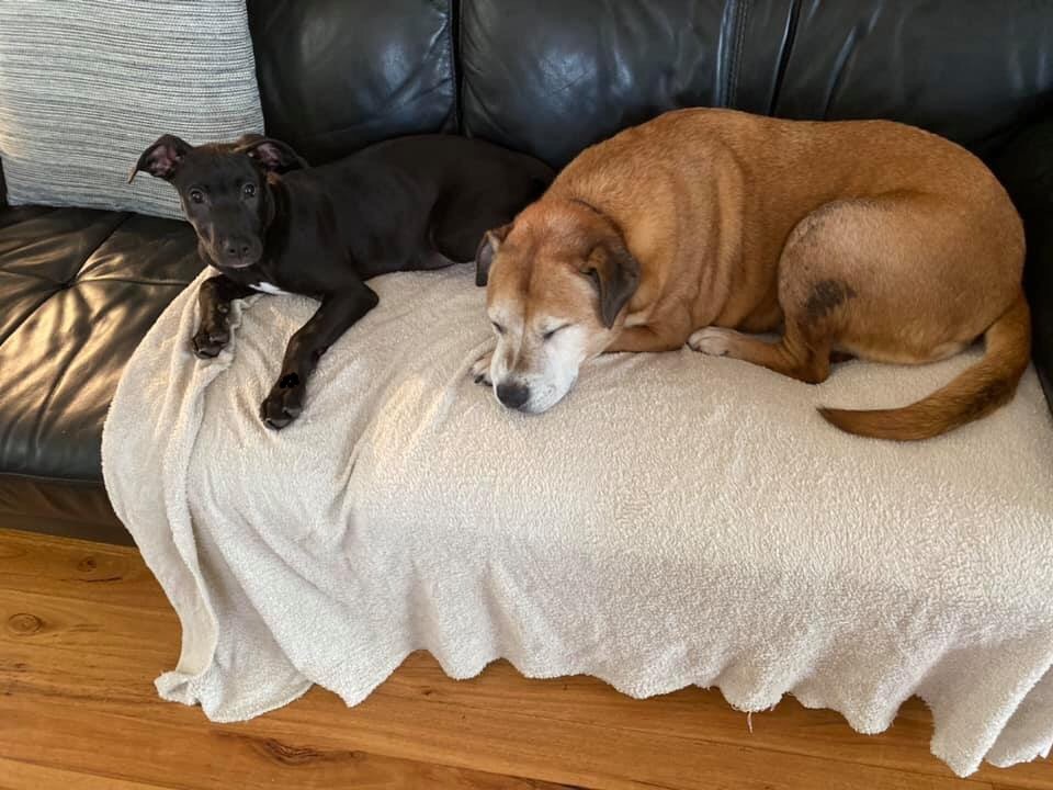 Poppy is very fond of her foster fur sister Coco and they nap together, share play time and tug of war, slightly unfair game as Coco is a 30kg staffy x mastiff!