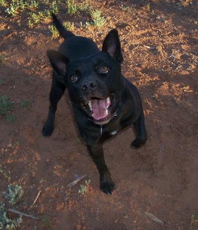 where ever you see lingus you will also see his squeaky plastic bone -- he loves it more than his food. He has the cutest little stance - - holds his front paw up ready for action -it's his little high five game. If you won't throw it he will throw it himself and will try every trick in the book to lure you into his game. He is quite happy to play 'chase my toys' with another dog -- but of course he always has the honour of getting it and bringing it back (so importantly) ready for the next go. Lingus is a staffy x - a small muscly little build and a very cute cheeky little face. Lingus is a bit choosy about his male doggy friends likes to try and let them know he is not that small