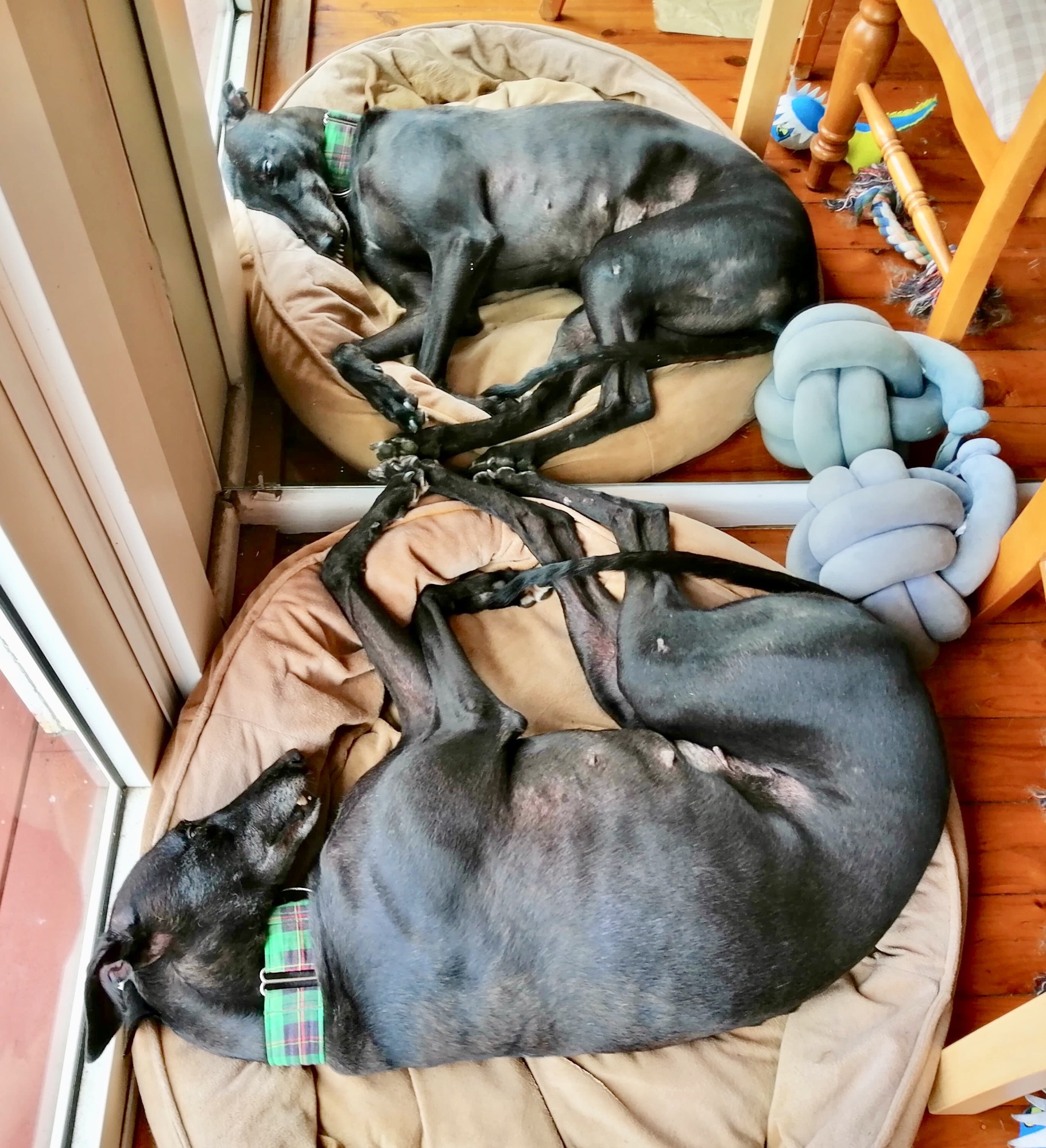 Millie is currently in foster with a greyhound sister, and they get along just fine. Millie has also met other dogs of various sizes when out and about, and she thought they were okay too.