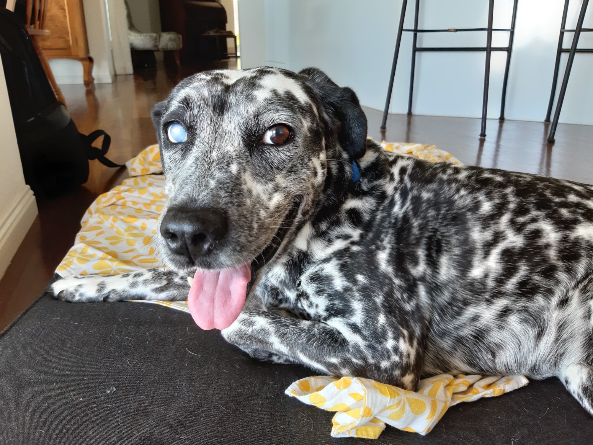 Holly is a cute, lovable lounge lizard most of the day but loves long walks to inspect the neighborhood. Holly would be great for a semi active family looking for a walking buddy but also wants a calm girl when at home. Holly is good with dog-savvy cats as well as kids of all ages. In Holly’s older age she can become more selective with her doggy friends so if you have any current dogs in your home bring them along to the meet and greet.