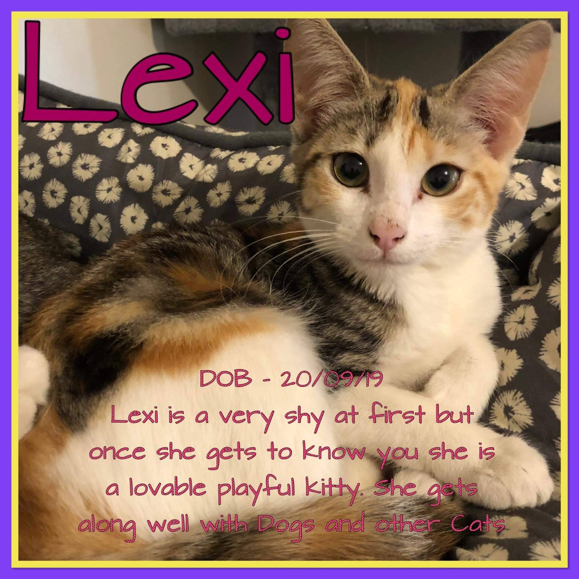 Lexi is a very shy girl at first but once she gets to know you she is a lovable playful kitty. She gets along well with dogs and other cats.