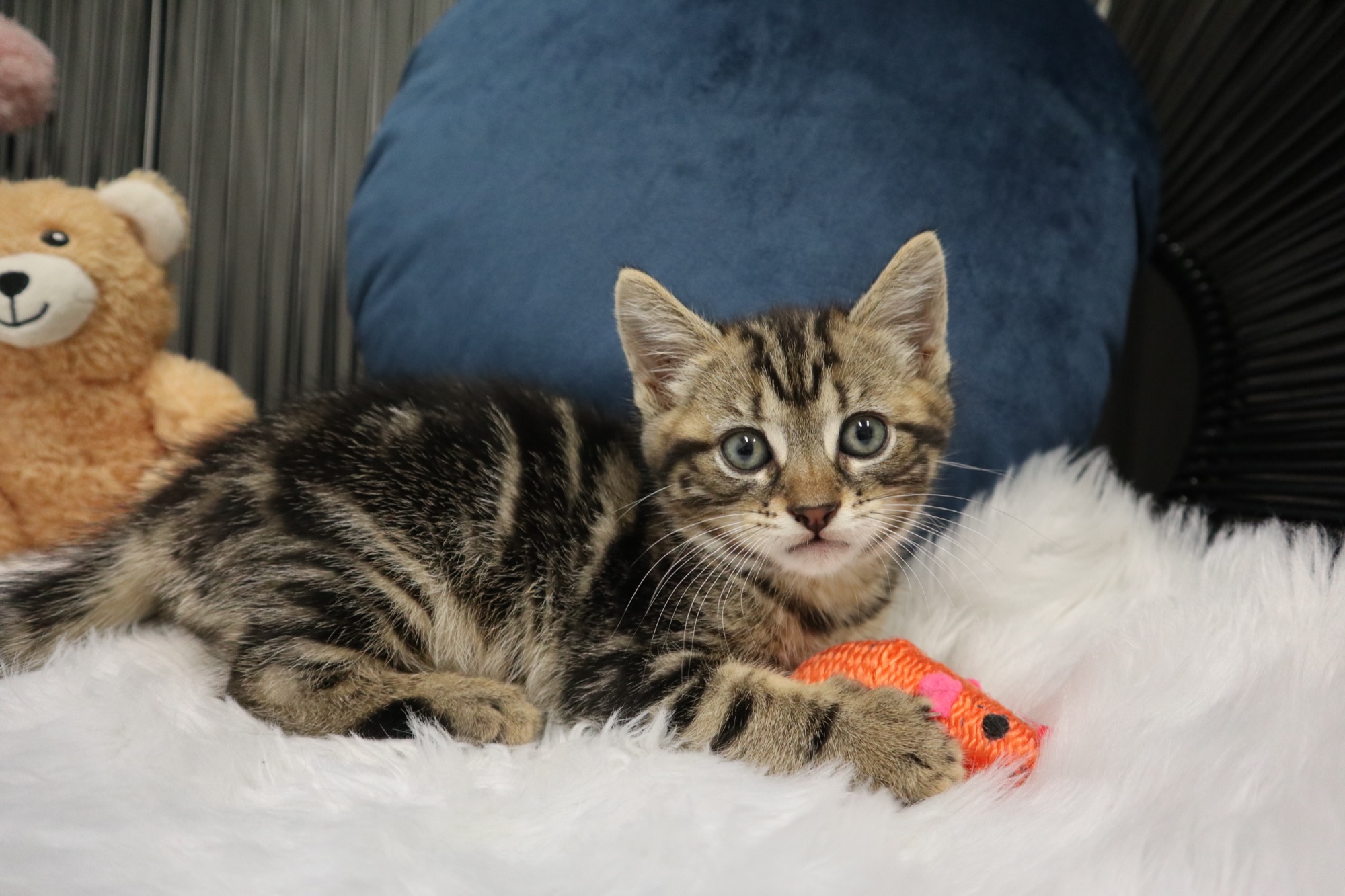 Indiana is an 8 week old Male Tabby Domestic Short Hair Kitten. He got his namesake from Indiana Jones as he loves to explore. He is a real sweetheart.