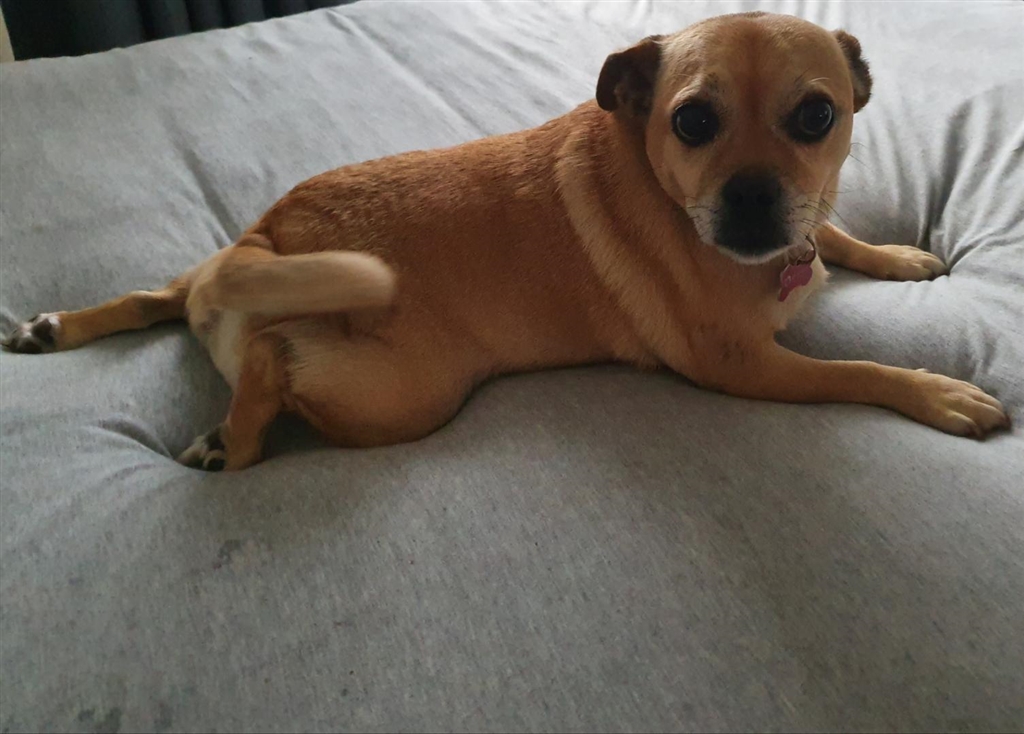 Peggy is good with small and older kids. She is good with cats and other dogs if introduced slowly. Does pull on lead a little when walking or when other dogs come along, and will bark,but with some more training will be ok. Is fine when walking together with another dog. Loves being around people and would prefer to be inside, but is ok outside also. Needs to be kept on a strict diet to control her weight.